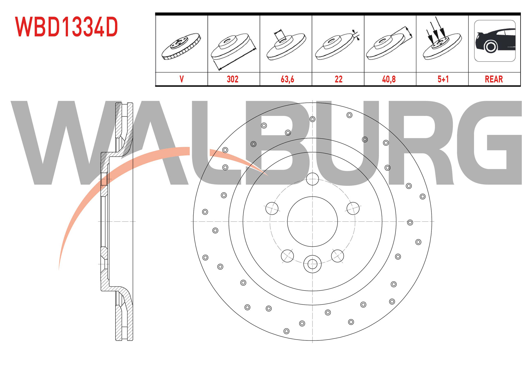 WALBURG WBD1334D | Fren Diski Arka Havalı Performans Delikli 5 Bjn 302X22x63,6X40,8 S60 II T3-T4-T5-D3-D5-2.0T (Elektronık El Frenı) 2010-/ S80 II D3-D5-T5-T6 2006-/ V60 T6-T5-D3-D5-1.6D 2010-/ V70 III 1.6D-2.0D 2006-/ Xc70 | 2 Adet