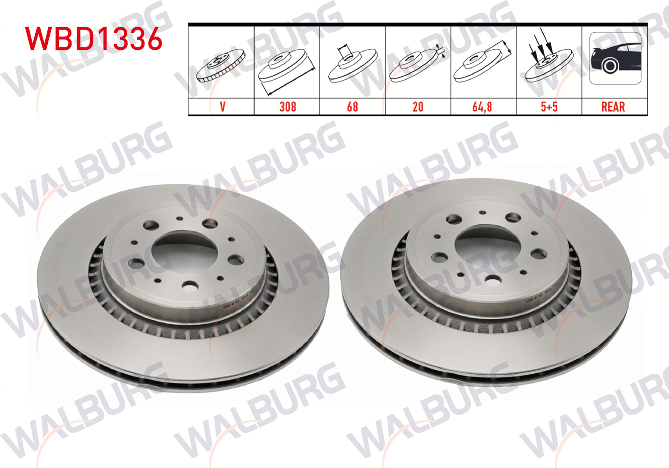 WALBURG WBD1336 | Fren Diski Arka Havalı 5 Bjn 308X20x68x64,8 Volvo Xc90 I 3.2İ 2002-2014 / Xc90 I 2.5 T 2002-2014 / Xc90 I D3 2002-2014 / Xc90 I D5 2002-2014 / Xc90 I T6 2002-2014 | 2 Adet