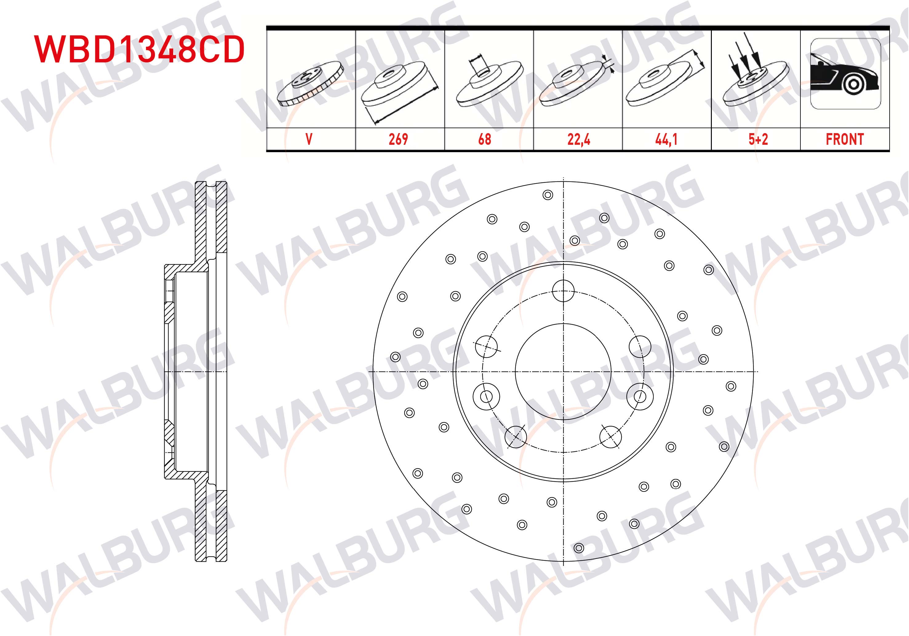WALBURG WBD1348CD | Fren Diski Ön Havalı Kaplamalı Performans Delikli 5 Bjn 269X22.4X68x44,1 Renault Megane IV Sedan (Lv-) 1.5 DCI 2016-/ Duster 1.6 16V 105 Hp 09-12 / Megane IV Sedan (Lv-) 1.2 TCE / Duster 1.5 DCI 09-12 | 2 Adet Takım