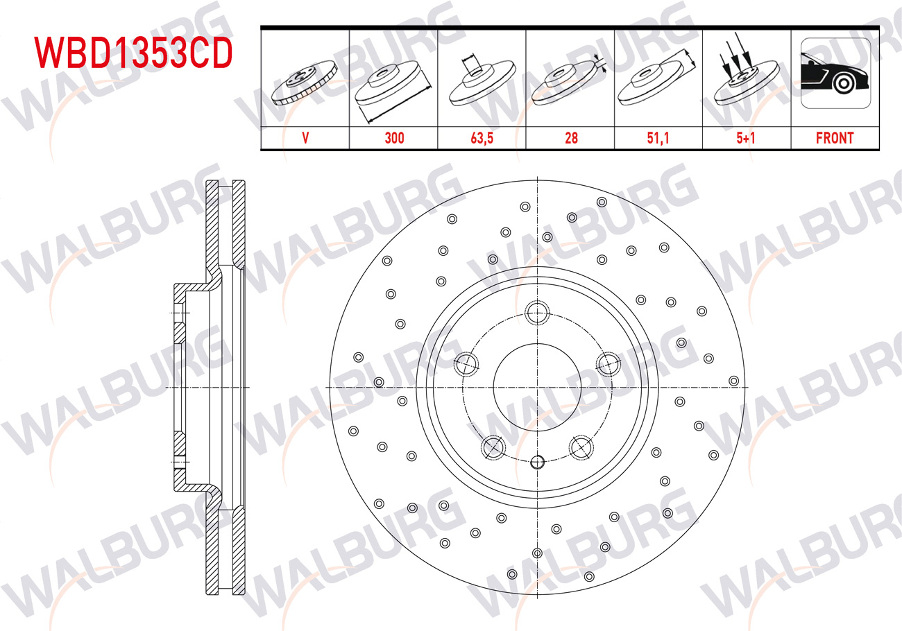 WALBURG WBD1353CD | Fren Diski Ön Havalı Kaplamalı Performans Delikli 5 Bjn 300X28x63,5X51,1 Ford Mondeo V 1.6 TDCI 2014-/ Mondeo V 1.5 Ecoboost 2014-/ Mondeo V 2.0 TDCI 2014 | 2 Adet Takım