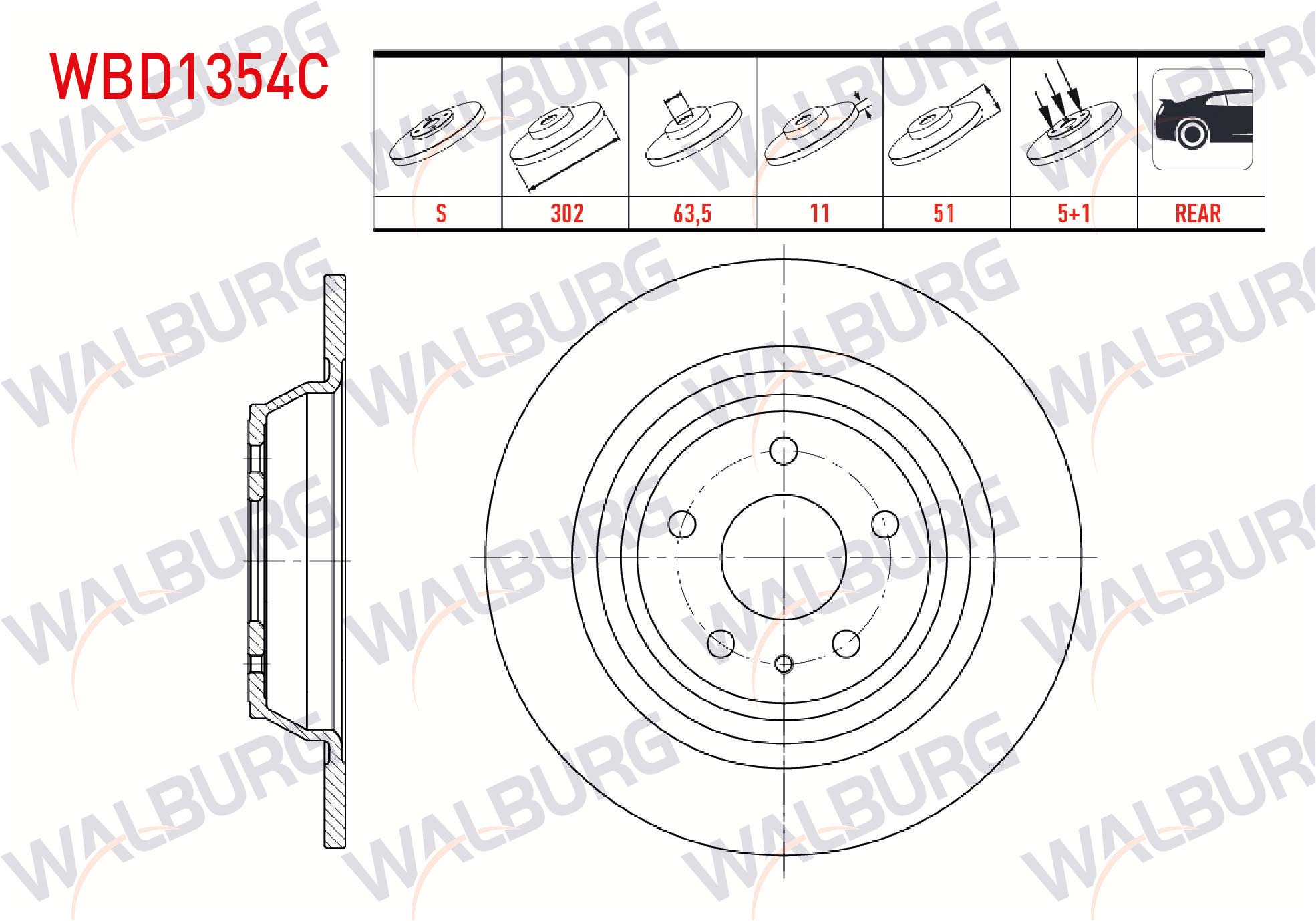 WALBURG WBD1354C | Fren Diski Arka Düz Kaplamalı 5 Bjn 302X11x63,5X51 Ford Mondeo V 1.6 TDCI 2014-/ Mondeo V 1.5 Ecoboost 2014-/ Mondeo V 2.0 TDCI 2014-| 2 Adet
