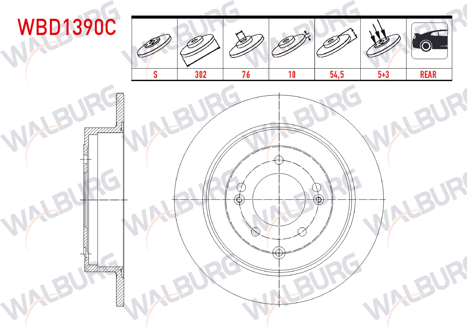 WALBURG WBD1390C | Fren Diski Arka Düz Kaplamalı 5 Bjn 302X10x54,5X76 Kia Sportage 1.6 GDI (Elektronık El Frenı Yok) 2015-/ Kia Sportage 2.0 CRDI 2015-/ Hyundai Tucson (Tle) 1.6 GDI-1.6 T-GDI 2015-| 2 Adet Takım