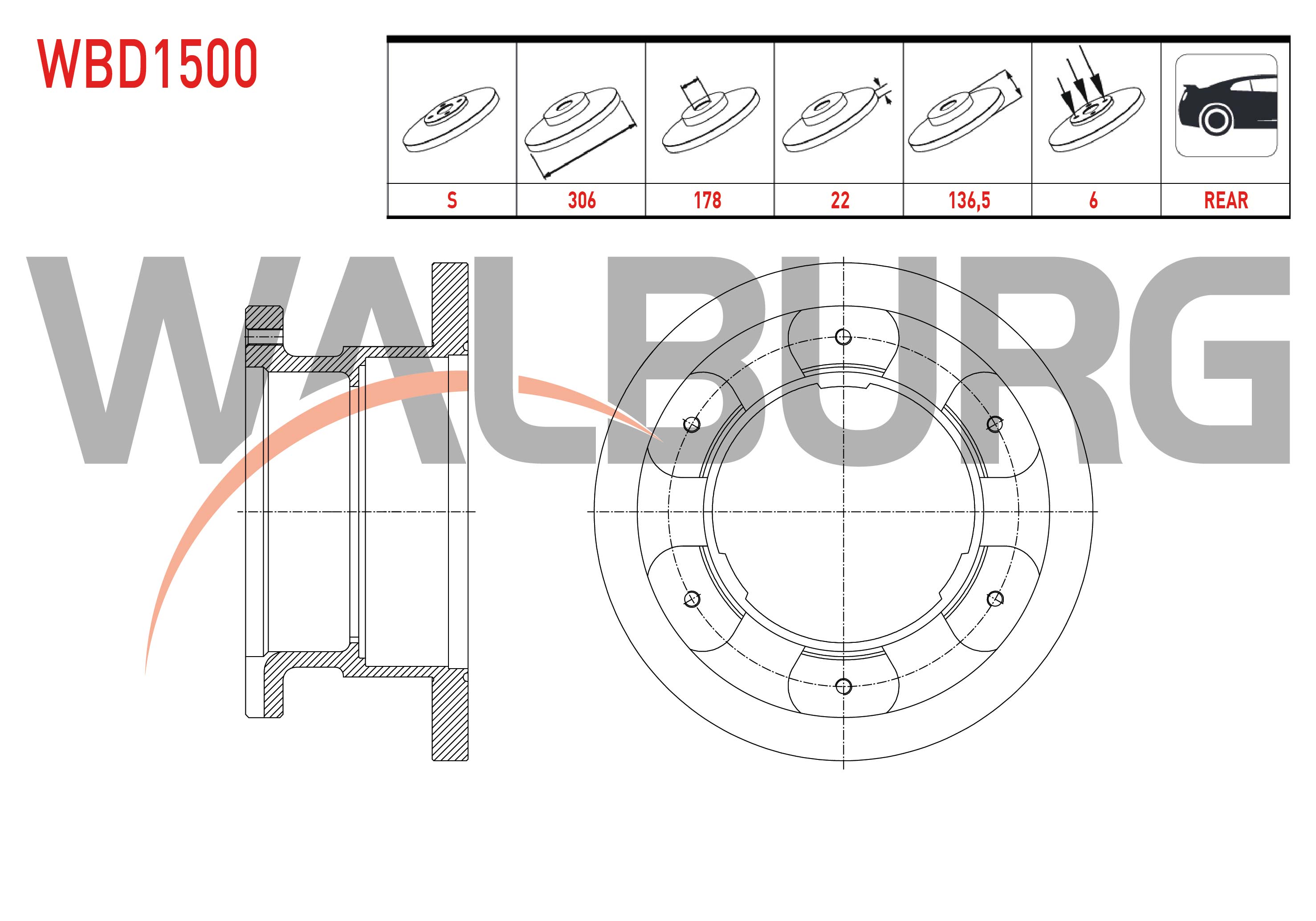 WALBURG WBD1500 | Fren Diski Arka Düz 6 Bjn 306X22x178x136,5 Iveco Daily III 2.8 D 1999-2006 | 2 Adet
