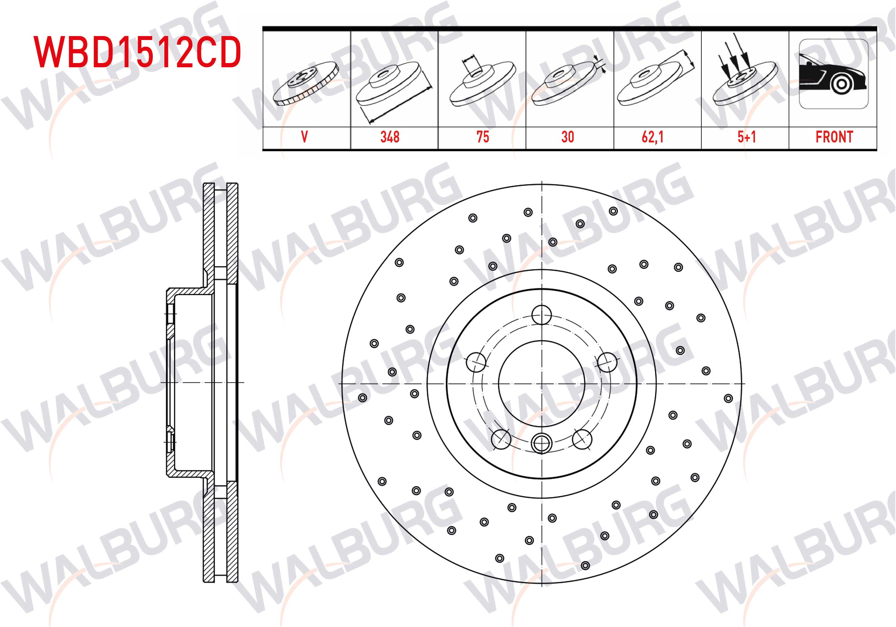WALBURG WBD1512CD | Fren Diski Ön Havalı Kaplamalı Performans Delikli BMW X5 (E70) 3.0 D 5 Bjn 348X30x75x62,1 2007-2012 | 2 Adet