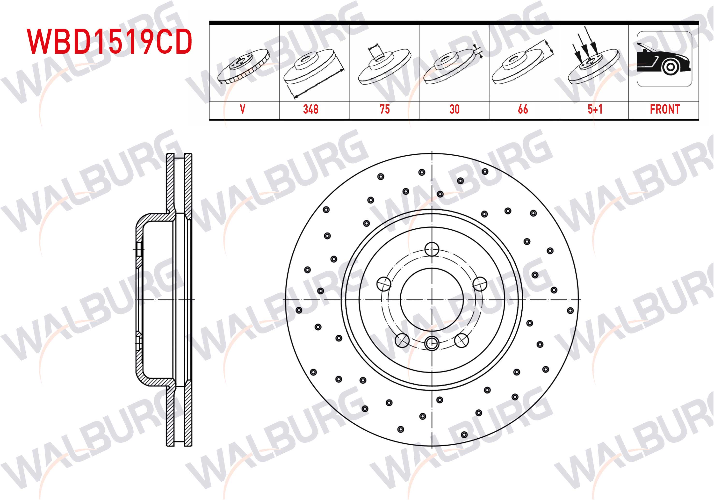 WALBURG WBD1519CD | Fren Diski Ön Havalı Kaplamalı Performans Delikli BMW 5 Serisi (F10) 525 D 5 Bjn 348X30x75x66 2010-| 2 Adet
