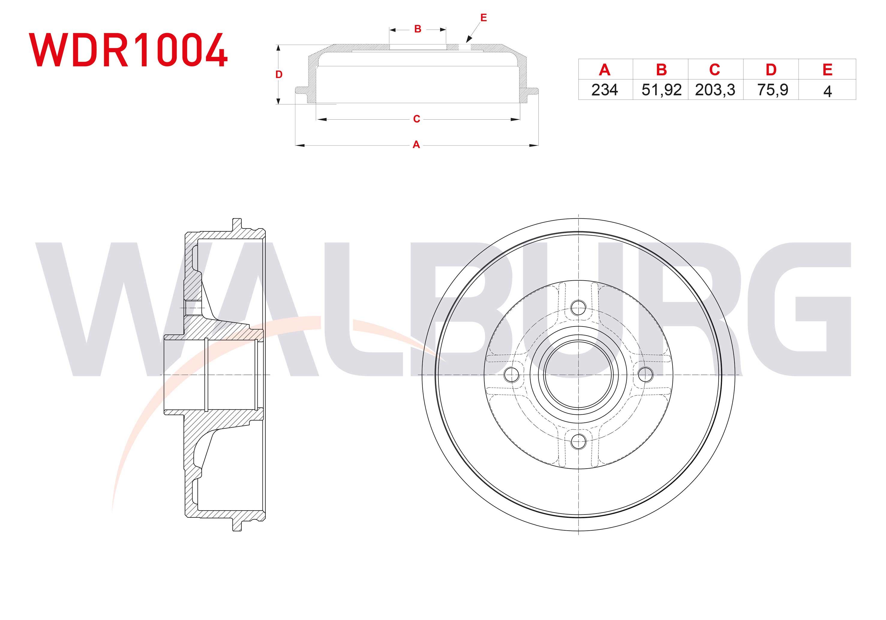 WALBURG WDR1004 | Fren Kampanası Arka (ABS'li Tip) 4 Delik 234X51,92X203,3X75,9 Renault Clio II, III 1998-2012 / Megane II 2002-2008 / Symbol II 2008-2012 / Modus 2004-/ Dacia Logan 2004-2012 / R19