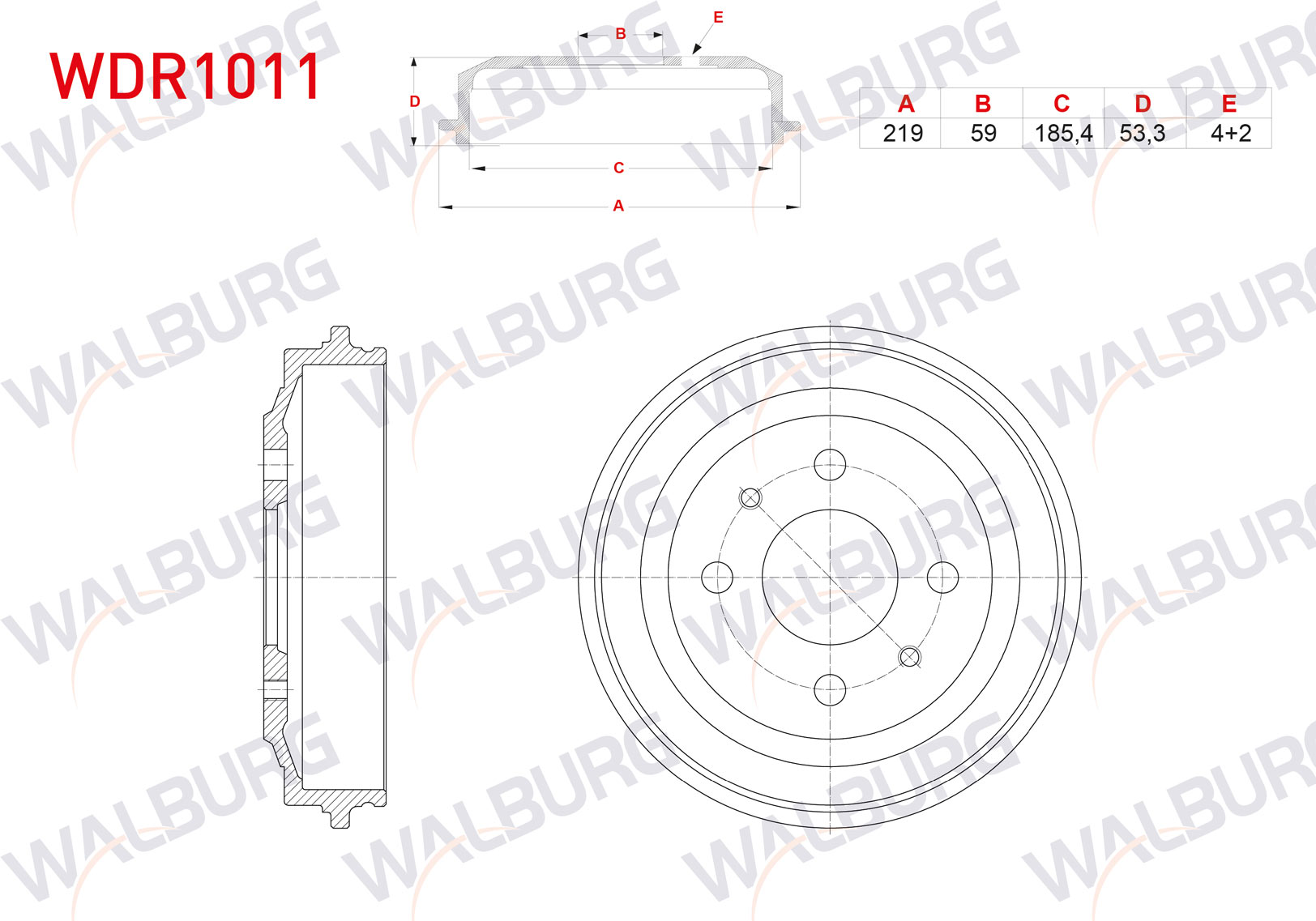 WALBURG WDR1011 | Fren Kampanası Arka 4 Delik 219X59x185,4X53,3 Fiat Uno 70 1.4İ 1994-2000 / Uno 60 1.1 1983-1996