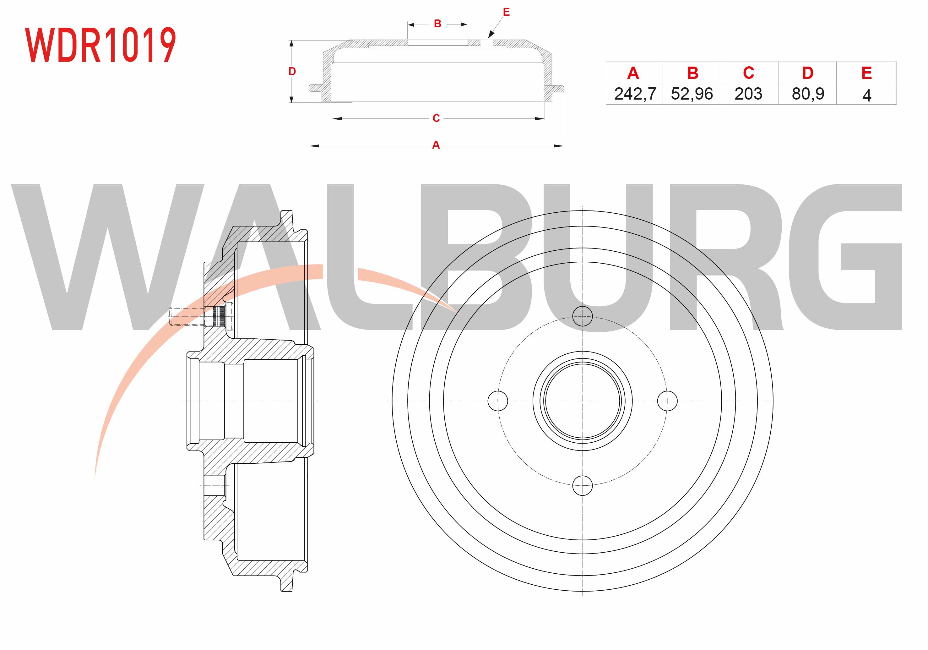 WALBURG WDR1019 | Fren Kampanası Arka 4 Delik 242,7X52,96X203x80,9 Ford Fiesta V 1.25İ-1.4İ 16V-1.4 TDCI-1.6 TDCI 2001-2008 / Fusion 1.4 TDCI-1.6 TDCI-1.6İ 2002-2010