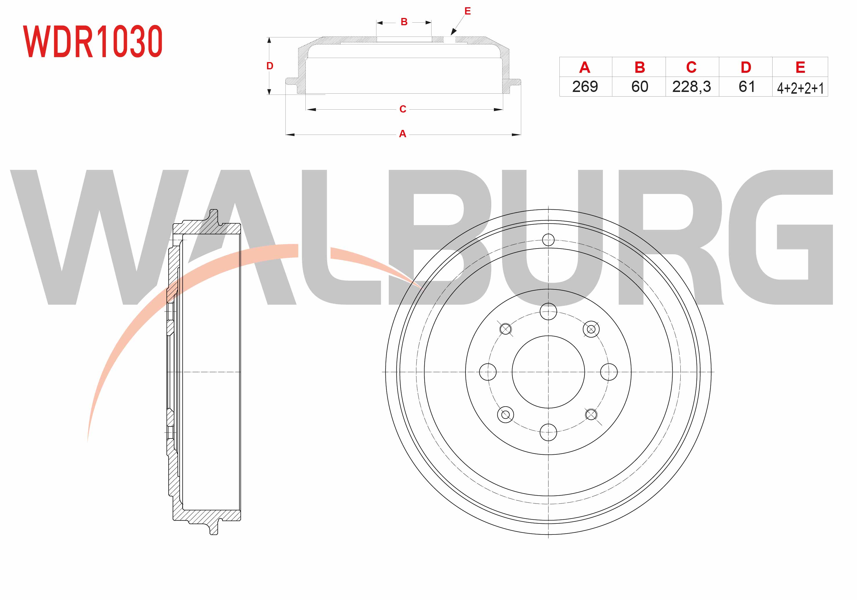 WALBURG WDR1030 | Fren Kampanası Arka 4 Delik 269X60x228,3X61 Fiat G.Punto 1.3 Mjt-1.4 2005-2012 / G.Punto Evo 1.3 Mjt-1.4 2008-2012 / Opel Corsa D 1.2-1.4-1.3 CDTI 2006-2014 / Corsa E 1.2-1.4-1.3 CDTI 2014 -