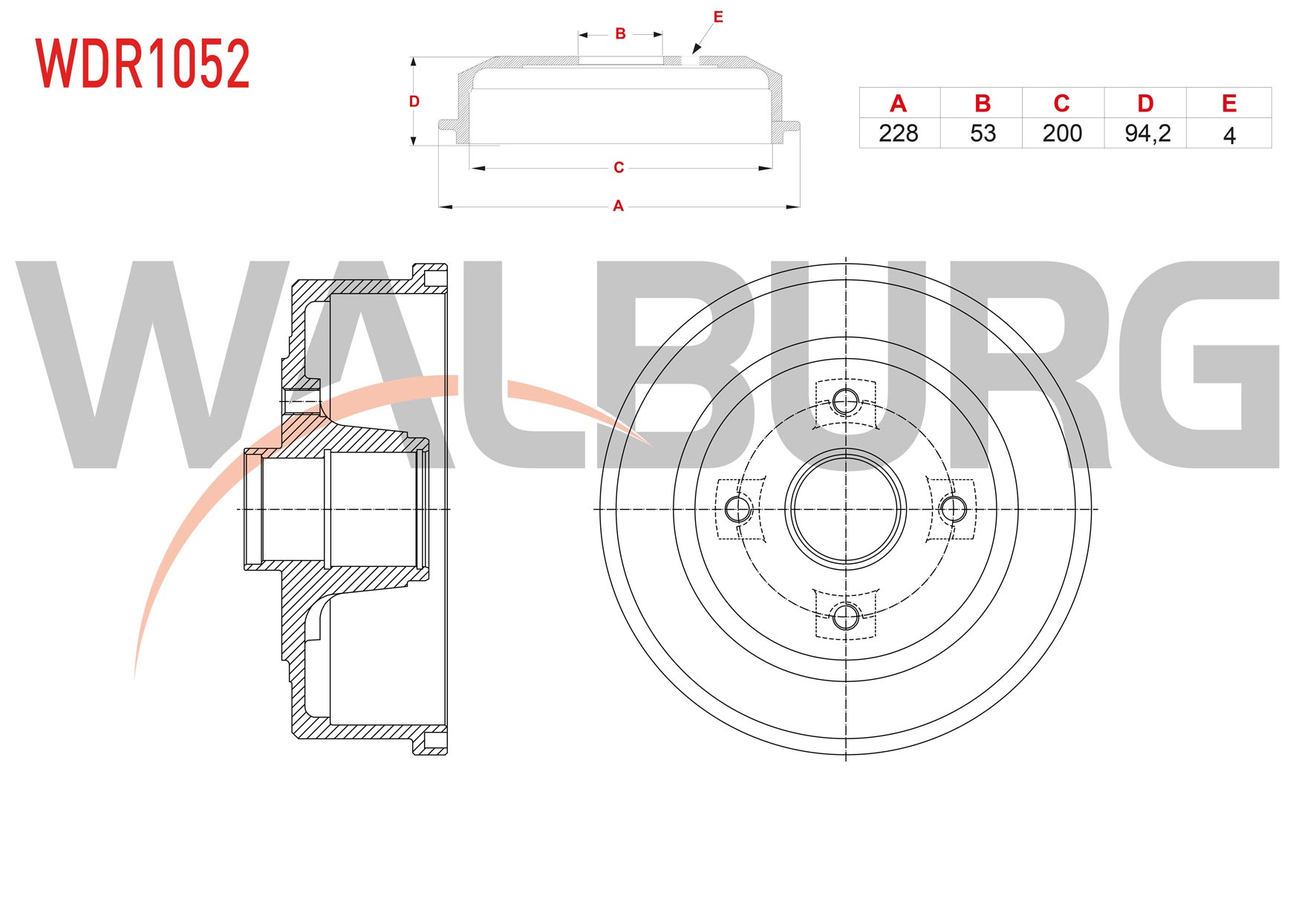 WALBURG WDR1052 | Fren Kampanası Arka 4 Delik 228X53x200x94,2 Opel Corsa C 1.0İ 12V-1.2 16V-1.3 CDTI-1.4İ-1.7 CDTI 2000-2006